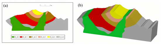 Dayue Mountain is located southeast of Mount Lu in Jiangxi Province and represents the second highest peak in the Mount Lu region. The measured data from geological records of Mount Lu [58] indicate that the 3D symbol model of Dayue Mountain (Figure 13b), generated based on the above parameters, reflects the structural characteristics of Dayue Mountain, such as equal stratum thickness, vertical anticline, and rounded hinge zone. The number of vertices and triangles is 16,755 and 28,418, respectively.