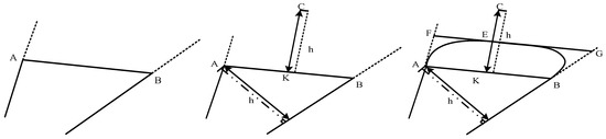 A box fold refers to a fold in which the strata are all overturned, and the hinge zone is flat and wide, similar to a box [64]. The box fold is a component of the world-famous Jura-type folds [65], which were developed in East Sichuan in China as well as in the Alps in Europe. In contrast to general folds, box folds typically have two hinges and a pair of conjugate axial surfaces. The parametric modeling method of fold symbols proposed in this paper cannot easily and directly realize the symbol modeling of box folds; therefore, a particular modeling method must be designed for box folds. According to the morphological characteristics of “two hinges and a pair of conjugate axial surfaces” of box folds, the middle cross-section of a box fold can be divided into left and right parts for modeling, and the topological transition at the middle junction should be guaranteed (Figure 21). The construction method of the stratum boundaries in the middle section of the box fold is as follows: (1) obtain the positions of inflection points A and B and the corresponding extension lines along the dip angles, according to the position of the inflection points and the occurrence of both limbs input by the user; (2) calculate the distance h from A to the extension line of B, take the midpoint K of AB, and make CK⊥AB so that the length of segment CK is equal to h; and (3) take point E on CK, according to the morphological parameter cur entered by the user, make FG//AB so that the dip extension lines of the two inflection points intersect with points F and G. After that, Bezier interpolation is carried out according to points A, F, E, E, G, and B to obtain the stratum boundary of the box fold; namely, the arc AEB.