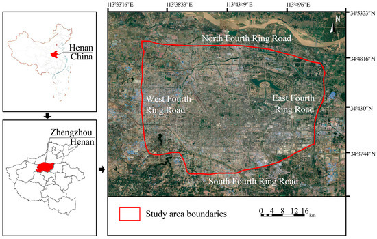 Based on the investigation of the current situation of building growth, the buildings in the Fourth Ring Road of Zhengzhou City, Henan Province, China were selected as the research objects. The study area is enclosed by four roads: East Fourth Ring Road, West Fourth Ring Road, South Fourth Ring Road, and Dahe road. The total length of the study area boundary is about 93.3 km (km), and the study area spans about 550 km2. The study area is shown in Figure 1.
