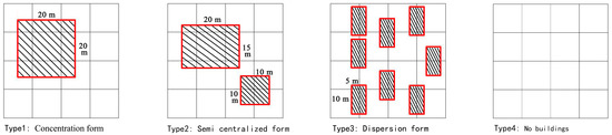 Figure 2 (Type1 to Type3) shows the basic pattern of the 2D plane distribution of buildings. In order to eliminate the influence of area on measurement results, the sum of plane distribution areas of each basic form is consistent. Type 4 indicates an area with few or no buildings.