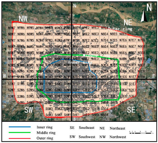 In order to detail the differences in architectural spatial form distribution throughout the study area, the study area was divided into 199 fine grids. The blank area in the study area is dominated by non-construction land, and the spatial form is homogeneous resulting in no grid division. Taking the central position of the study area (113°40′33″, 34°44′26″) as the coordinate origin, a rectangular coordinate system was established. The 199 grids are numbered according to their orientation, as shown in Figure 4.