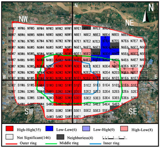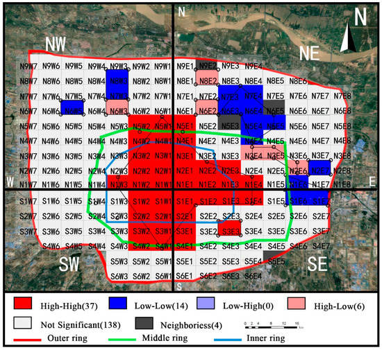 This rule is more evident in the local auto-correlation analysis (Figure 8). H-H agglomeration is mainly distributed around the middle ring, with the main area composed of N5W1-N1W3-S4W1-S1E4-N1E4. L-L clusters are mainly distributed in the northwest, northeast, and southeast between the middle and outer rings and are defined by N7E4-N6E3-N4E4-N5E5 and N1E6-S1E6-S1E7. In addition, the L-L agglomeration also includes grid N2E7, the rectangular region N8W3-N7W3, and grid N6W5. The H-L configuration is scattered mainly in the northwest between the middle ring and the outer ring and is composed of N3E4-N2E6-N3E5, grid N6E2, grid N8E2, and grid N6W3.