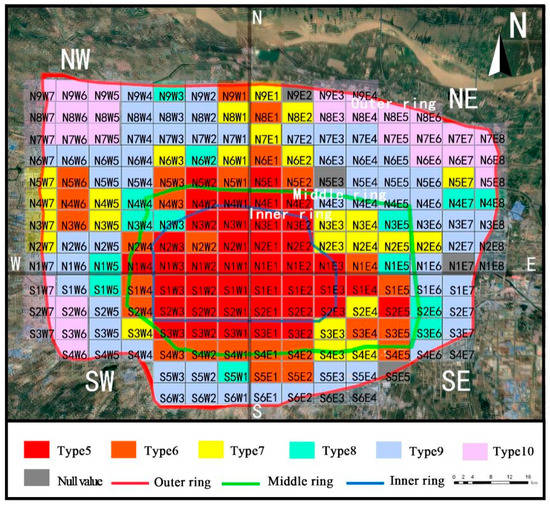 This rule is verified in local auto-correlation analysis. As shown in Figure 6, two H-H clusters (Type 1) occupy the western half of the middle ring. The large H-H cluster is enclosed by N5E1-N1W4-S1W4-S6W1-N1E3, and the small H-H cluster is enclosed by N3W4-N4W4. The L-L cluster (Type 3) mainly occupies in the northeast area between the middle ring and the outer ring, and the main area is surrounded by N7E4-N4E3-N5E5. Finally, the H-L clusters (Type 2) include N3E5-N2E6-N2E7, N5E2-N4E2, S1E6-S1E7, and grid N5E7, mainly located in the east and north between the outer ring and the middle ring. The L-H grid does not appear.