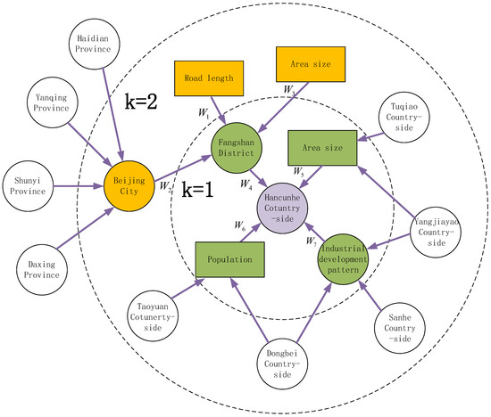 According to the Laws of Geography, the closer the distance, the greater the correlation between objects. Therefore, there exist certain similarities among the countryside ecological patterns of geographic adjacent countryside. When there are too many neighbors of a countryside entity in the countryside knowledge graph, it will bring too much computational pressure and non-essential neighborhood information. Therefore, we limit the visiting spatial scale of each countryside entity’s neighborhoods, instead visiting the whole path-reachable entities . For each countryside entity, it only visits neighborhood nodes times and obtains subset , referring to Formula (5). This ensures that the aggregation of neighborhood entities does not expand outward indefinitely while keeping enough information of high relevance: