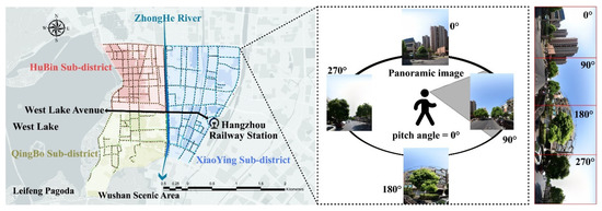 This study was conducted in the sub-regions of the Hubin, Qingbo, and Xiaoying streets in the Shangcheng District of Hangzhou, China. This area is adjacent to the West Lake Scenic Area and is the old city of Hangzhou’s core area (Figure 1). It contains elements such as commercial streets, business buildings, old and newly constructed residential areas, railway stations, underground lines, scenic spots, and various support facilities; it also presents strong diversity and reflects, to a certain extent, the style and function of a city. This area provided an ideal basis for this study.