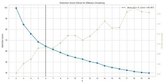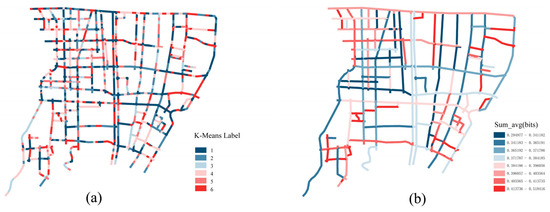 This section demonstrates the performance of local visual perception on a single street using the clustering algorithm. First, we used principal component analysis (PCA), which reduced the original data matrix from eight to three dimensions while retaining 95% of the original data’s information, then we used the K-means algorithm to add clustering cluster labels to the data. The optimal number of clusters was determined by “elbow method”, utilizing the yellowbrick package in Python to determine, as illustrated in Figure 5, that the dataset clusters optimally when K = 6. To visualize the distribution, we projected k-means labels onto the map (Figure 6a). The clustering algorithm revealed that the VPIQ classification of the streetscape sampling points was more pronounced, with more streetscape images in the local area classified in the same category, not just on the same street, indicating a degree of correlation in the streetscape VPIQ within the local area.