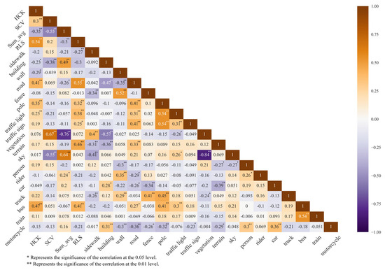 The Pearson correlation analysis between the SCV and HCK in SPSS is shown in Figure 7. HCK was significantly correlated with Sum_avg, RLS, building area, walls, roads, streetlights, traffic signals, and buses. Among them, Sum_avg, building area, and walls were negatively correlated, indicating that when a greater proportion of these street elements was present, the VPIQ of the street space tended to be more consistent, resulting in a more balanced visual experience when visiting the same street. However, SCV was significantly correlated with the relative length of the street, buildings, vegetation, and sky. Only vegetation was positively correlated, indicating that streets with significant fluctuations in the total value of VPIQ (larger SCV) due to spatial variation may have a higher rate of green vision. This suggests that visual perception is more sensitive to street green space and requires strict control of the amount of vegetation.