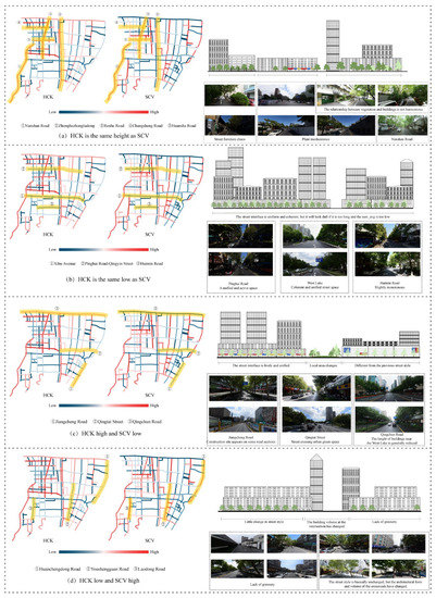 Although HCK and SCV showed a significant positive correlation, there were still many streets with high and low distributions of SCV and HCK. Thus, this section discusses four scenarios based on a combination of two measures, HCK and SCV, which correspond to the four different types of streets in the study area. Policy constraints indicated restrictions on the nature of business and land use, landscape referred to the arrangement of street elements at the street interface.