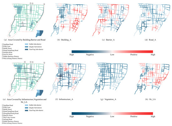 The regression coefficient for Hc_LA (Figure 9h) is less significant (mean = −0.017) than that for Building_A, most likely because of some overlap in the information explained by the two variables. The positive correlation is more pronounced in areas with a diverse mix of businesses and prominent building façades. The variety of buildings, windows, and signs along the street contributes a wealth of visual information. As can be seen, a diverse mix of businesses frequently results in a more visually appealing street interface [68], increasing visual information; for instance, in the commercial area of the Hubin sub-region, the entirety of Jiefang Road, the railway station, and Wuliu Xiang areas. In contrast, business density is generally sparse and homogeneous in negatively related areas, such as the southern section of Nanshan Road, the northern section of Zhonghezhong Road, and the northeast corner of Xiaoying Street. The regression results of Hc_LA can reflect to some extent whether the business dynamics of the location match with the street appearance, so as to measure the reasonableness of the store appearance and street interface. Areas with strong positive and negative correlation will be extra sensitive to the matching of street business positioning and style atmosphere, and should be used as a reference in the pre-planning stage.