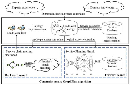 To address the above challenge, we propose a domain constraints-driven automatic service composition approach for online land cover geoprocessing. First, a land cover service ontology was proposed to describe the land cover tasks, data, and services and assist in constructing land cover domain constraints. Second, a constraint-aware GraphPlan approach with service parameter constraints and logical process constraints was proposed. In the forward search process of GraphPlan, services were filtered and pruned by logical process constraints, which can accurately capture the true composition relationships between atomic services and improve the accuracy of service composition. In the GraphPlan backward search process, service parameter constraints were used to guide the direction of the service search in order to find the optimal service composition solution. Finally, the methods in this paper were integrated into a web system for online land cover geoprocessing and proved their validity.