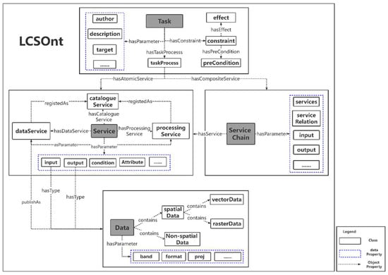 According to the domain characteristics of land cover service, we developed a land cover service ontology (LCSOnt) to describe the data, land cover service, and the relationships between services in a unified way, which is the central basis of the whole work. The ontology consists of four parts (Figure 2), i.e., task ontology, data ontology, service ontology, and service chain ontology.