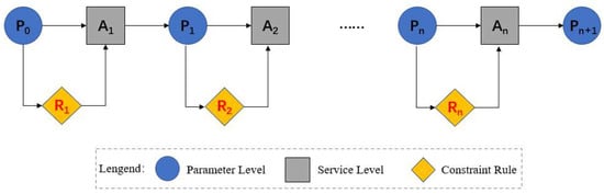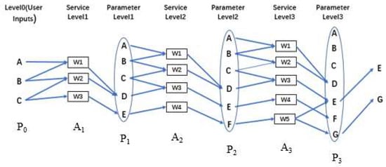 The service planning graph is a directed acyclic hierarchical graph containing two levels, parameter level P and service level A (Figure 3). The first level of the service planning graph is the parameter level P0, whose nodes are composed of user request input parameters. The second level is service level A1, where the input parameters for each service node contain the first-level parameters. The third layer is the parameter layer, which contains all the parameters of the P0 layer and all the output parameters of the A1 layer, and so on, alternating between P and A. The final layer is the parameter layer, consisting of the output parameters expected by the user.