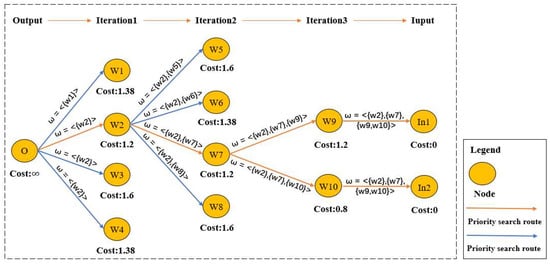 Figure 5 shows a simplified implementation of the backward search algorithm graphically, and one can see that the algorithm tends to select low-cost nodes to achieve the target. The improved A* algorithm can find the optimal service composition solution by guiding the search direction through the service parameter constraints. For the final output of the algorithm, the service queue must also be arranged in reverse order to form a service chain, which is returned as the final result of the land cover task.