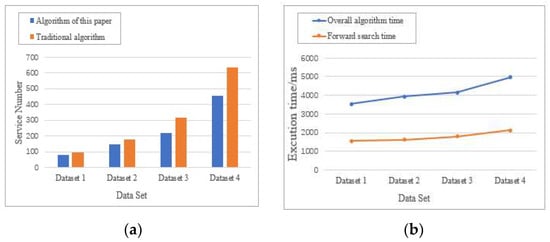 The results of our evaluation of this algorithm are presented in Figure 6. The first experiment was conducted using the traditional planning graph construction algorithm compared to the planning graph construction algorithm proposed in this paper (Figure 6a). In this figure, the horizontal axis represents the various data sets, while the vertical axis represents the number of services in the service planning graph. The results show that the algorithm which generates service planning graphs through logical process constraints reduces the redundancy of the graph. The more the number of services, the more pronounced the effect is. This can improve the efficiency of subsequent service recommendations, discovery, and composition. The second experiment shows the execution time results for the overall algorithm and the forward search algorithm with different data sets (Figure 6b). The test procedure was run 30 times for each data set, taking into account the unnecessary effects of the operating system and virtual software background processing, and the average of the algorithm execution times was evaluated. Results show that as the number of services increases, the service execution consumption time grows smoothly.