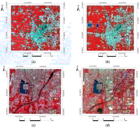 (a) The Landsat 8 image acquired in 2013 in Dezhou City, Shandong Province, China. (b) The Landsat 8 image acquired in 2018 in Dezhou City, Shandong Province, China. (c) The Sentinel-2 image acquired in 2016 in Liaocheng City, Shandong Province, China. (d) The Sentinel-2 image acquired in 2021 in Liaocheng City, Shandong Province, China.