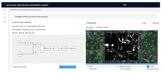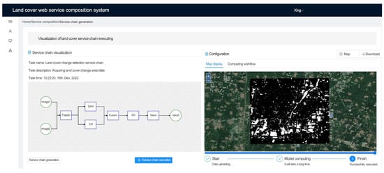 In the system, the service composition module consists of three steps: data preparation, dynamic generation of service chains, and visualization of service chain execution. The data preparation step requires uploading the input image data and then filling in the necessary relevant information about the remote sensing image and the expected data product type. After the information is completed, the system can generate a land cover change detection service chain automatically. Finally, execute the service chain and visualize its results.