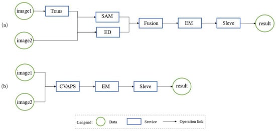 Two generated change detection service chains. (a) A service chain based on the constraint-aware GraphPlan algorithm; (b) A service chain bases on the traditional GraphPlan algorithm.