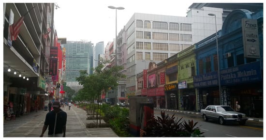 Kuala Lumpur (KL), the capital of Malaysia, is considered one of the most important financial centres in Southeast Asia and a very attractive tourist destination [51]. The selected area of the study was located within a section of Jalan Tuanku Abdul Rahman (JTAR) starting from the junction of Jalan Dang Wangi towards the intersection of Jalan Tun Perak. This stretch of the street was selected due to its historical importance and being perceived as one of the most successful shopping areas in the Klang Valley (Figure 1).