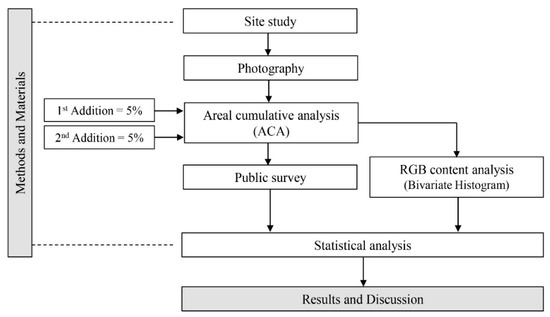 The study methods can be divided into two main sections, data collection and data analysis. The data were mainly collected via two means, namely site photography and a public survey. On the other hand, the analysis stage comprised three processes: areal cumulative analysis, RGB content analysis, and statistical analysis, as seen in Figure 3.