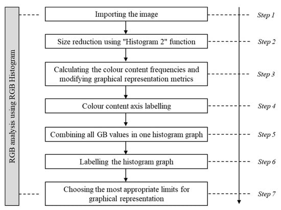 Each picture contains 65,025 pixels with each pixel having a value for red, green, and blue. The steps needed to perform the RGB bivariate histogram analysis are shown in Figure 5. In this technique, the outcome can be exported in multiple CSV formats including the colour content data, jpeg formatted graphs representing two colours juxtaposed to each other, and a graphical representation of the colour content measured by frequencies and intensity (Figure 6 and Figure 7).