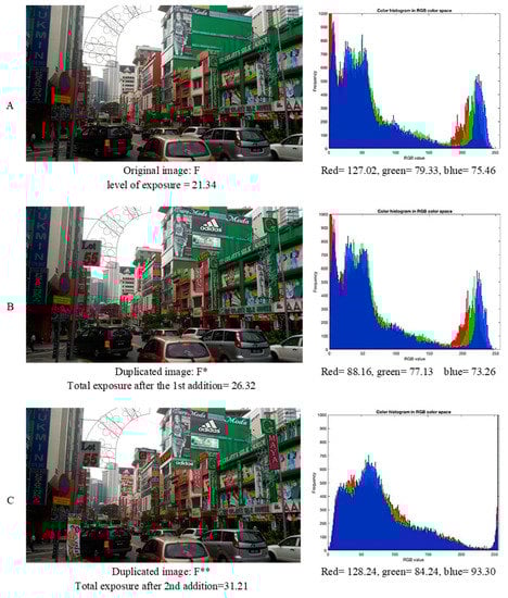 A sample original picture (Code F), the additions made of approximately 5% increments, and the respective RGB histogram. Whereby (A) represents the original photo, (B) represents the photo after 1st addition, and (C) represents the photo after 2nd addition.