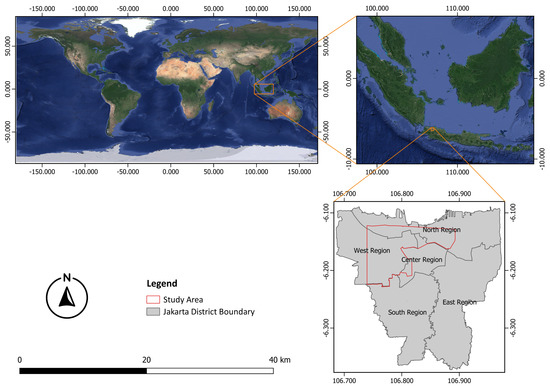 Maps of Jakarta’s location with respective regional administrative boundaries and selected study area.