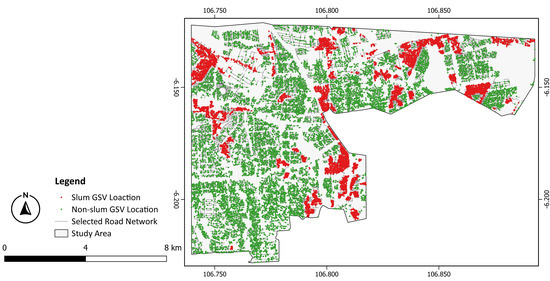 Random points were generated along the minor road and branch road network, with an approximately equal number divided into slum and non-slum areas of the modified slum reference data using “random points along line” tool in QGIS. Any points that fell on boundaries between slum and non-slum areas were excluded to avoid confusing the DL classifier, i.e., any point which contains slums in the SVI directed east and non-slums in the SVI directed west would hamper the algorithm from learning features to distinguish the different classes. We eventually arrived at 6903 random points for slum areas and 7339 random points for non-slum areas, as shown in Figure 4.