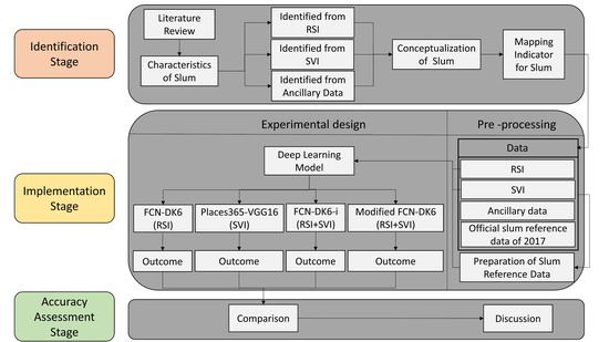 The research workflow consists of three phases (Figure 5). First is the identification stage, which characterizes slums in the study area and updates the reference slum map using RSI, SVI and ancillary data. Second comes the implementation phase, consisting of (i) data preprocessing and (ii) experimental design and running models. In the third and final stage, the accuracy values obtained for different models are compared.
