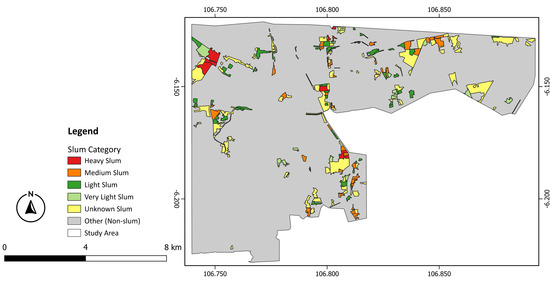 Official slum boundaries were provided by the local government of Jakarta in 2017 (RW Kumuh). These slum boundaries are divided into four categories: heavy (Berat), medium (Sedang), light (Ringan), and very light (Sangat Ringan). Figure 2 displays these official boundaries and the four categories. As discussed in Section 1 and Section 2, the definition of slums varies from place to place and person to person. For this research, therefore, we combined important slum indicators formulated and utilized by governmental institutions and academic literature to create a single definition of slum and a corresponding set of slum indicators. Further, the official reference map was modified according to this definition, as discussed in the Data Preparation Section below and used as reference data to measure the accuracy of slum maps derived using RSI and SVI through the DL network.