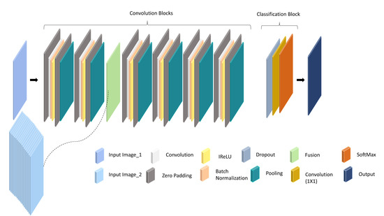 As shown in Figure 9, the first input was routed via the 1st and 2nd convolution block, and the output from the 2nd convolution block was fused with the second input at the fusion and created a fused layer. After that, the fused layer was fed to the remaining convolution blocks, i.e., 3rd, 4th, 5th, and 6th, respectively, the output from the 6th convolution block was passed to the classification block, and the final classification map was generated using the Modified FCN-DK6_2 network. In this process, the first input is RSI and the second input is a stacked SVI feature map. Similarly, fusion was done at each convolutional block, i.e., 1st, 3rd, 4th, and 5th individually, and the final classified output was generated using Modified FCN-DK6_1, Modified FCN-DK6_3, Modified FCN-DK6_4, and Modified FCN-DK6_5 network. The network parameters during the training phase were the same as for FCN-DK6 (see Table 2).