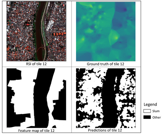The accuracy assessment can also be disaggregated according to the types of slums identified in the modified slum reference map, where the class “unknow slum” refers to parts of the RSI that were visually identified as slums according to the characteristics labeled in Table 1 but not officially classified as slum in the provided reference data (see Section 3.2.2—Data Preparation on how the reference data was modified). The result for Modified FCN-DK6_2 is presented in Table 4 and Figure 10 depicts the outcome generated by Modified FCN-DK6_2 on tile-12. Similarly, Figure A1 depicts the outcome generated by Modified FCN-DK6_2 on tile-3 in annexure-A.