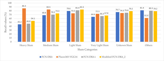 We wanted to analyze how different combinations of input datasets affect the understanding of the DL model for various categories of slums. Therefore FCN-DK6, Places365-VGG16, FCN-DK6-i, and Modified FCN-DK6_2 were selected. Only Modified FCN-DK6_2 was selected from Modified FCN-DK6 experiments as it performs better than others. The predicted outcome generated using FCN-DK6, Places365-VGG16, FCN-DK6-i, and Modified FCN-DK6_2 was further broken down into various categories of slums, as shown in Figure 11.