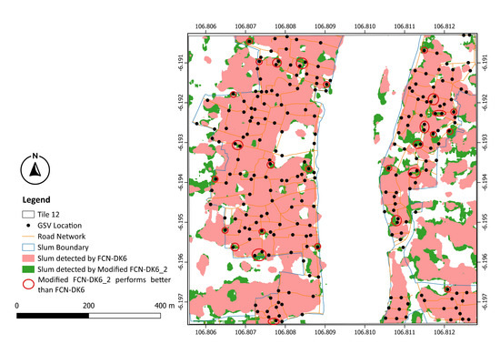 The outcome generated by Modified FCN-DK6_2 and FCN-DK6 for tile-12 (location highlighted by red circle represent those places where Modified FCN-DK6_2 perform better than FCN-DK6 because of the availability of GSV location).