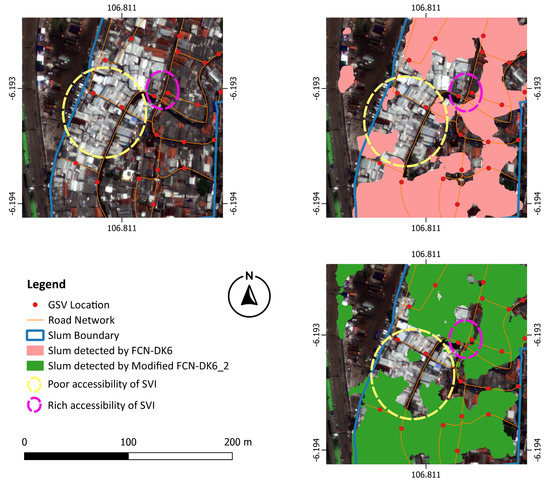 Comparison of the outcome generated by Modified FCN-DK6_2 and FCN-DK6 for tile-3. (Location highlighted by red circle represents those places where Modified FCN-DK6_2 performs better than FCN-DK6 because of the availability of GSV location).
