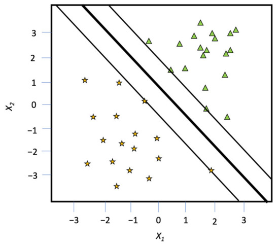 The simple idea behind the SVM classifier can be viewed in Figure 2, which is based on the maximum margin classifier [32]. Here, a maximal margin hyperplane is computed, where the hyperplane separates out two classes and is the furthest from any of the training data. The observations that fall on the boundary, or on the outside of the extent of the hyperplane, are transformed into a ‘slab.’ These edge points are support vectors. However, most natural datasets cannot be separated as nicely as the example. Support vector machine classifiers allow a nonlinear decision boundary to separate the classes.