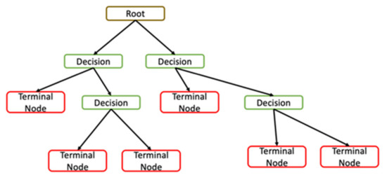 In ArcGIS Pro, the random trees classifier is a supervised classification method, based on the random forest statistical method [32] (p. 311). A series of decisions are made based on the statistical makeup of the classes, as well as the image overall. The decisions branch out together and form what looks like tree branches (Figure 3). When the entire image is classified, many instances of classification are performed on subsets of the data, therefore creating many decision trees [35]. It is called a random forest method is because each classification is made from a random subset of training pixels, selected from the overall image, and the final classification is based on the most frequent tree output from several trees. Using multiple trees is meant to mitigate overfitting to the training samples provided by the user.
