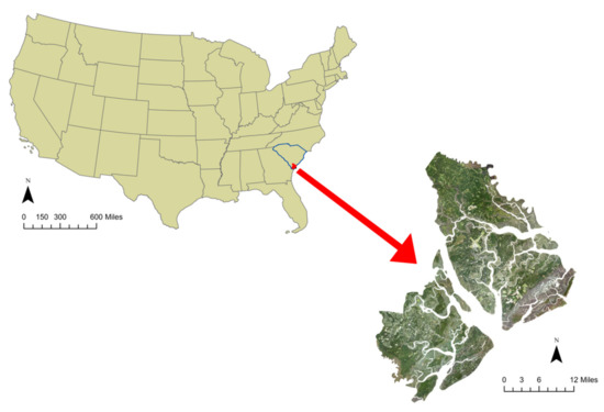 Beaufort County is one of South Carolina’s populous counties, nestled in the southern coast of the state (Figure 4). From 2010 to 2019, the population in Beaufort County grew from 162,233 to 192,122, an increase of 18.4% [46]. It ranks as the wealthiest county in the state, with respect to the median household income of USD 68,377. Beaufort County is home to half of the state’s salt marshes [47]. According to [48], South Carolina salt marshes and coastal wetlands provide services in the four ecosystem service categories: provisioning, regulating, cultural, and supporting. Each of these categories, though not all marketed services, provide valuable resources to coastal communities. For example, the salt marshes serve as a nursery habitat to many species, especially shrimp. South Carolina’s commercial fishing industry, which relies upon these environments, generates 42 million USD annually to the state economy [49]. Other services, such as flood protection, carbon sequestration, filtration, and tourism, all contribute to the enormous value these marshes have to the South Carolina coast. The predominate species of marsh vegetation is Spartina Alterniflora. Juncus Romerianus is also commonly found. The county is home to a diversity of several land cover types, including wetlands, forests, large water bodies, extensive housing and commercial developments, and agriculture. As the county’s population continues to grow in a dynamic and complex coastal environment, the importance of monitoring change using accurate classification methods is critical for future planning and measuring trends in socioeconomic and ecological health.