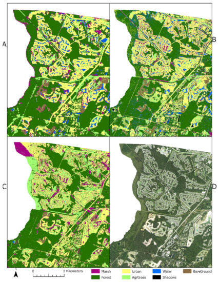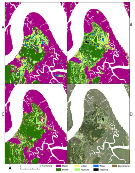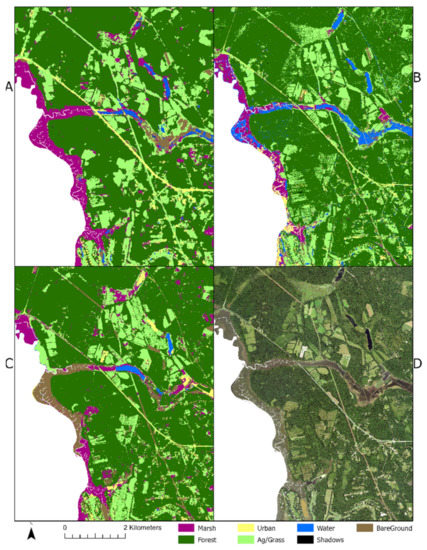 It is well known that marsh extent is difficult to map, especially when the tidal range varies throughout the imagery. These tidal discrepancies made classifying the marsh difficult for each classifier in this study (Figure 8). Marsh was sometimes misclassified as water, urban, bare ground, and even grass. If images were collected during low tide conditions across the entire study area, classifications could have been more accurate. Water hues, ranging from blue to algae-ridden green waters, made classifications of water and grass difficult, as well. Ancillary information, such as texture, RGB-based indices, or even a DEM, might assist in the differentiation between some of the more troubled classes. Some inland areas in and around small ponds were also misclassified as marsh. This is similar to RF, which struggled to differentiate the water class from the marsh class in nearly every inland pond (as shown in Figure 7C).