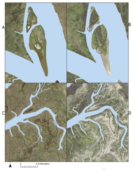 Examples of marsh vegetation gain (A,B) and loss (C,D) from 2009 to 2019.