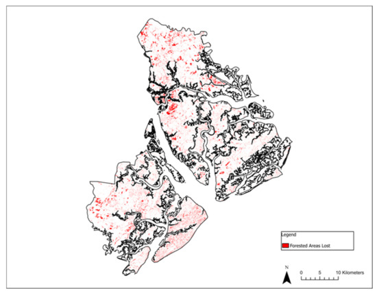 Following the classification of both the 2019 and 2009 images of Beaufort County, a change detection analysis was conducted using the change detection tool in ArcGIS pro v.2.8.1. The tool requires an input of a series of maps or images and computes a change detection map and change matrix in return. For the change detection analysis, a final classification map, with the combined classes, was created. The water, shadows, marsh, and forest classes remained intact, but the agriculture/grass, bare ground, and urban classes were combined into a class called development. Areas of change were assessed based on the numbers of pixels that changed from a particular class to another. Pixel counts were multiplied by the 1 m × 1 m pixel size to determine the approximate area in meters squared. Further conversion from m2 to ha was accomplished by multiplying by 0.0001.