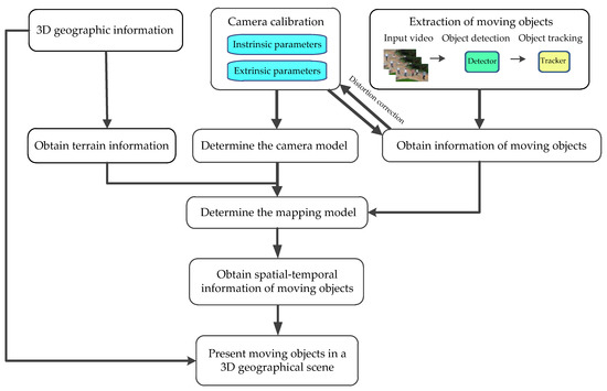 Video information can be collected by cameras from different geographic locations, which is a sequence of images (frames). If security operators are not familiar with the monitoring area, they cannot obtain the location of the objects from these images. The integration of a video and GIS can unify the objects that they are interested in. By doing this, the spatial–temporal information of moving objects can be displayed in a 3D geographic model, which can help to implement the measurement of objects and enhance the visual multi-dimensional representation of GIS. The fusion framework of 3D geographic information and moving objects in surveillance video is shown in Figure 1.