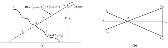 Ray intersection with the DSM. (a) Calculation model of the intersection’s location between an imaging ray and the DSM; (b) When , there is interpolation.