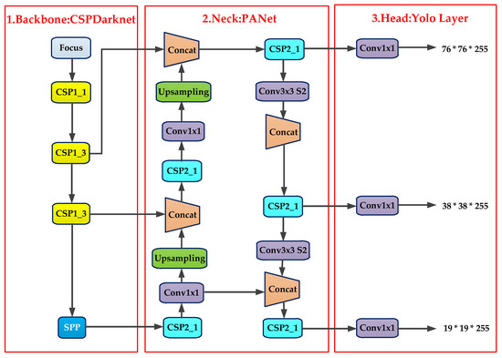 The network architecture of YOLOv5. (1) Backbone: CSPDarknet for feature extraction; (2) Neck: PANet for feature fusion; (3) Head: YOLO layer for prediction.
