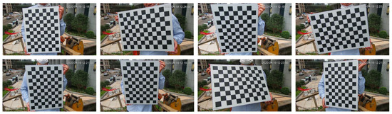 As shown in Figure 5, an alumina model plane with an array of 12 × 9, a square side length of 40 mm, and an accuracy of 0.01 mm was used. A few images of the model plane under different orientations were taken by moving the plane. We used these images to calibrate this camera by the Zhang Zhengyou calibration method [14]. To obtain a higher calibration accuracy, the images with large average reprojection errors were deleted. Finally, 15 images were chosen for calibration. The results of the calibration are as follows:
