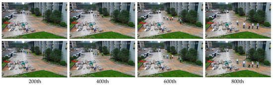 The proposed method was adopted to detect and track pedestrians in the surveillance video, and some original frames and tracking frames were selected (Figure 7). As can be seen from Figure 7, there is no matching error for the five moving objects, and the tracking results are good.