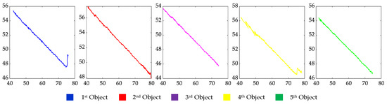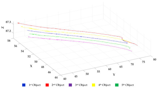 In Figure 15, we can intuitively see that all of the five objects walk along the gaps among the floor tiles. The first and fourth objects make two right-angle turns; the second, third and fifth objects all walk straight. As shown in Figure 15b, c, the five objects’ trajectories are identical to the actual walking routes. In Figure 15a, the object trajectories can be found to perch on the ground, and there is no suspension, which indicates that the elevation error is small. Figure 15 shows the consistency between the mapped trajectories and the actual trajectories, which fully demonstrates that the method in this paper can extract objects’ spatial–temporal information and has a high positioning accuracy.