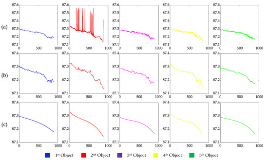 The elevation trajectories of moving objects in the world coordinate system. (a) The original trajectories in elevation; (b) the trajectories in elevation filtered by median filtering with the window size of 25; (c) the trajectories in elevation filtered by a cubic polynomial. The ordinate is Z (m), and the abscissa is the video frame number in (a–c).