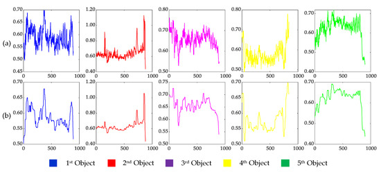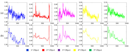 The height of moving objects. (a) The original calculation results of the object height; (b) the calculation results of the object height filtered by median filtering. The ordinate is the height (m), and the abscissa is the video frame number.