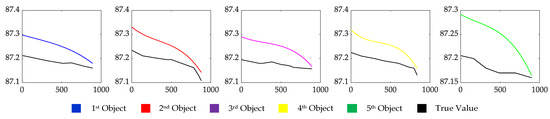 As shown in Figure 14, with the increase in the number of frames, all of the elevation errors show a decreasing trend, which is mainly affected by the accuracy of the DSM. The monitoring area is located between two tall buildings, and the objects are moving from the middle of the two tall buildings to the open area outside. Affected by satellite signals, the accuracy of the data acquisition of the 3D model is poor in the middle area and better in the outer open area, resulting in the uneven accuracy of the DSM. The data in Figure 14 are statistically analyzed to obtain the ME and RMSE of each object (Table 6). It can be seen from Table 6 that the ME of the five objects in elevation are all within 10 cm, and the RMSE are all within 3 cm, which has a high elevation accuracy.