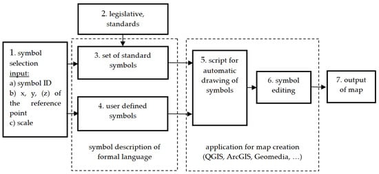 It is clear from relevant literature that problems of creation, formal description and visualization on digital map products are solved from many perspectives and in various contexts. All the presented methods are inspiring, and include original ideas, but none of them solve this problem comprehensively. Cartographic symbols creation is application-dependent in many cases. The methods proposed for the description of cartographic symbols are, in many cases, based on Cascading Style Sheets for Maps—CartoCSS [29] or OGC (Open GeoSpatial Consortium) Symbology Encoding [30]. The advantage of these tools is their versatility and flexibility, the disadvantage is the relative complexity of the description and the need to know the syntax of these languages, which requires good knowledge of information technology. The method proposed in this article tries to remove the previously mentioned problems.